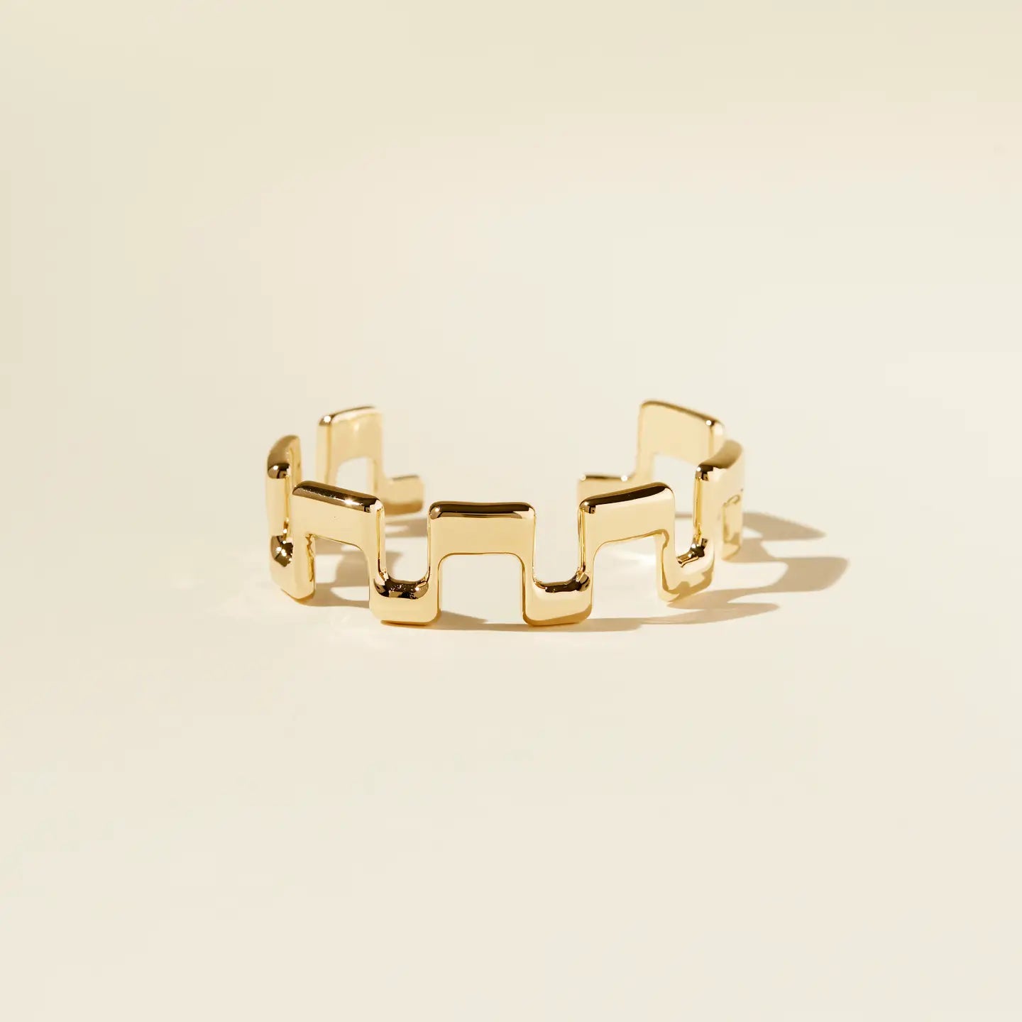 A 1960’s inspired rectangular pattern wraps around your wrist with a satisfying weight. A high polish makes this a beautiful statement cuff. Gold plated brass Fits small to medium size...
