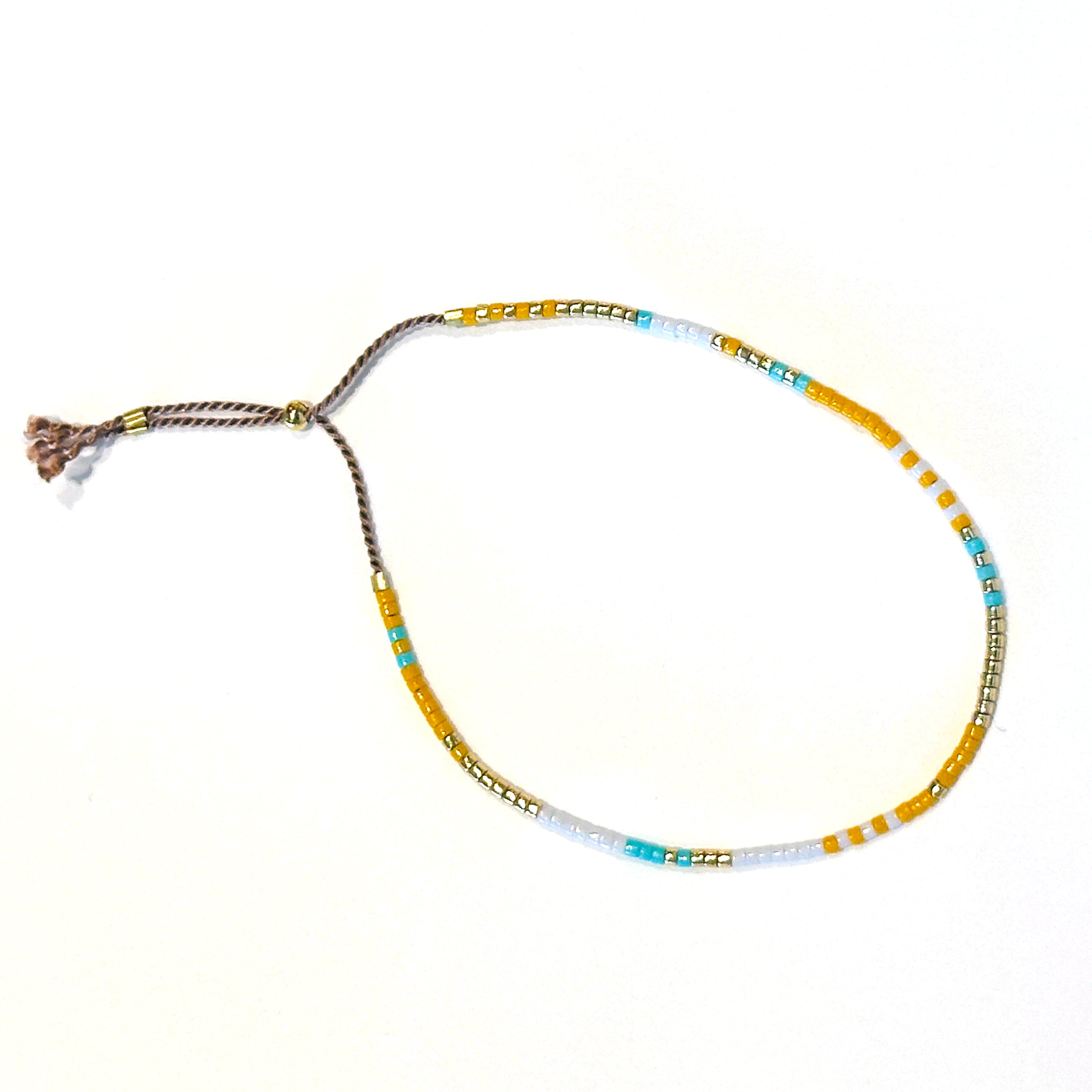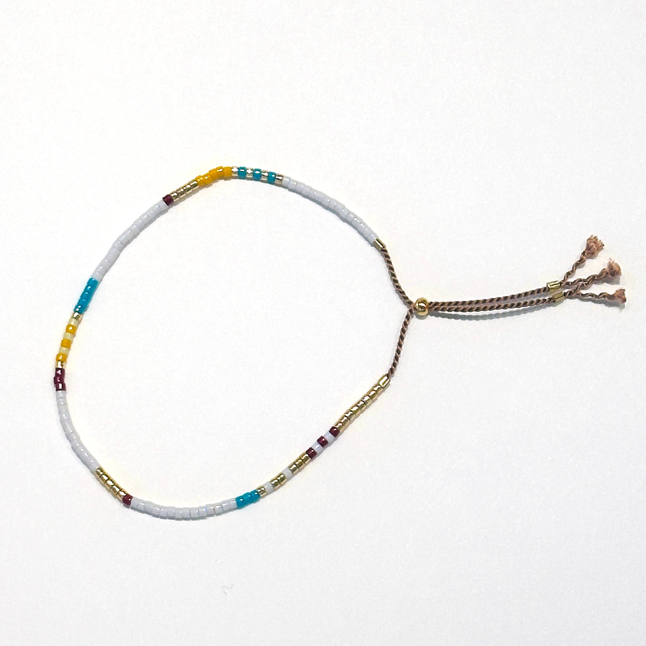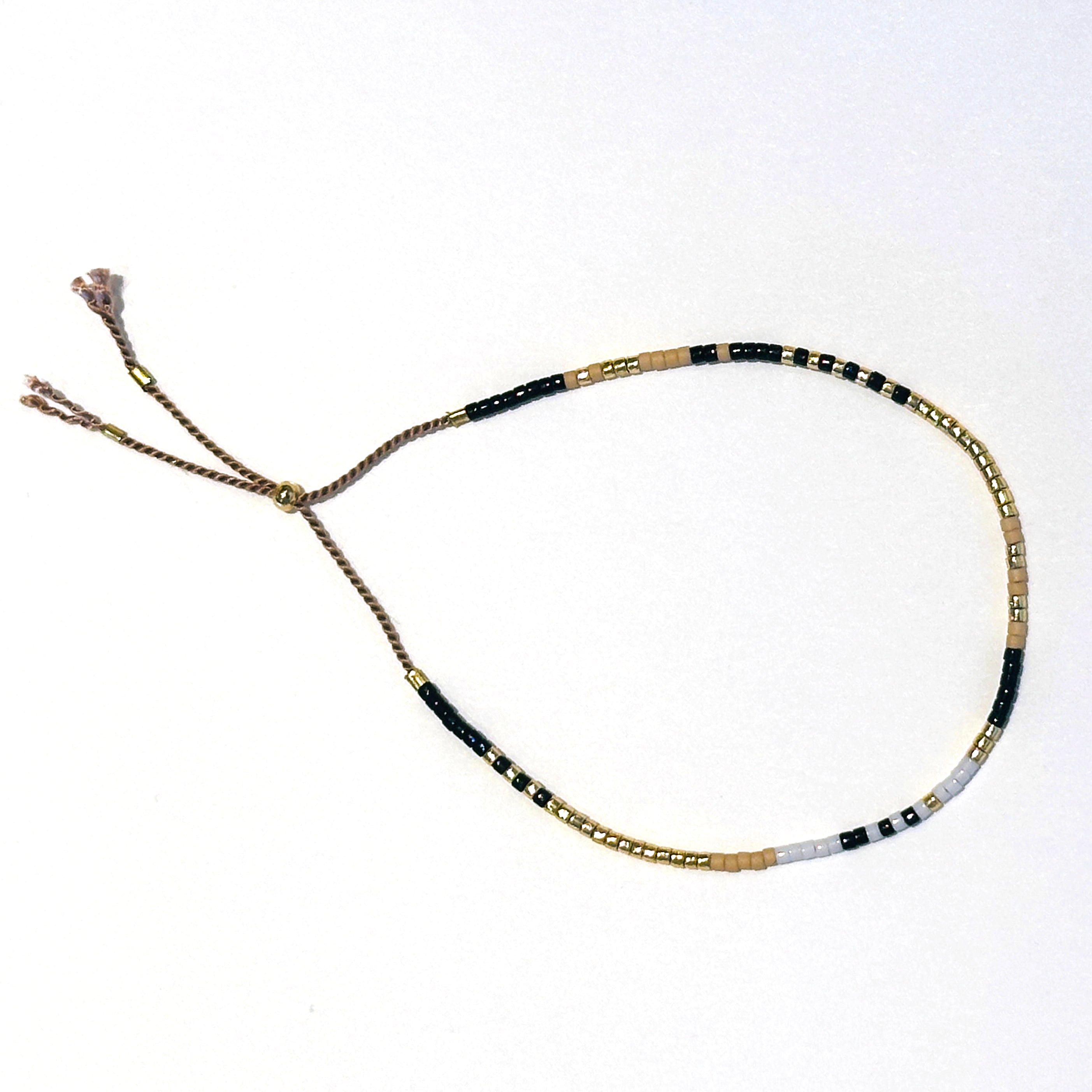 These thin and sparkly bracelets are beaded by hand with high quality Japanese seed beads. Strung on 100% silk cord. The crimp beads and sliding clasp are gold plated. Adjustable...