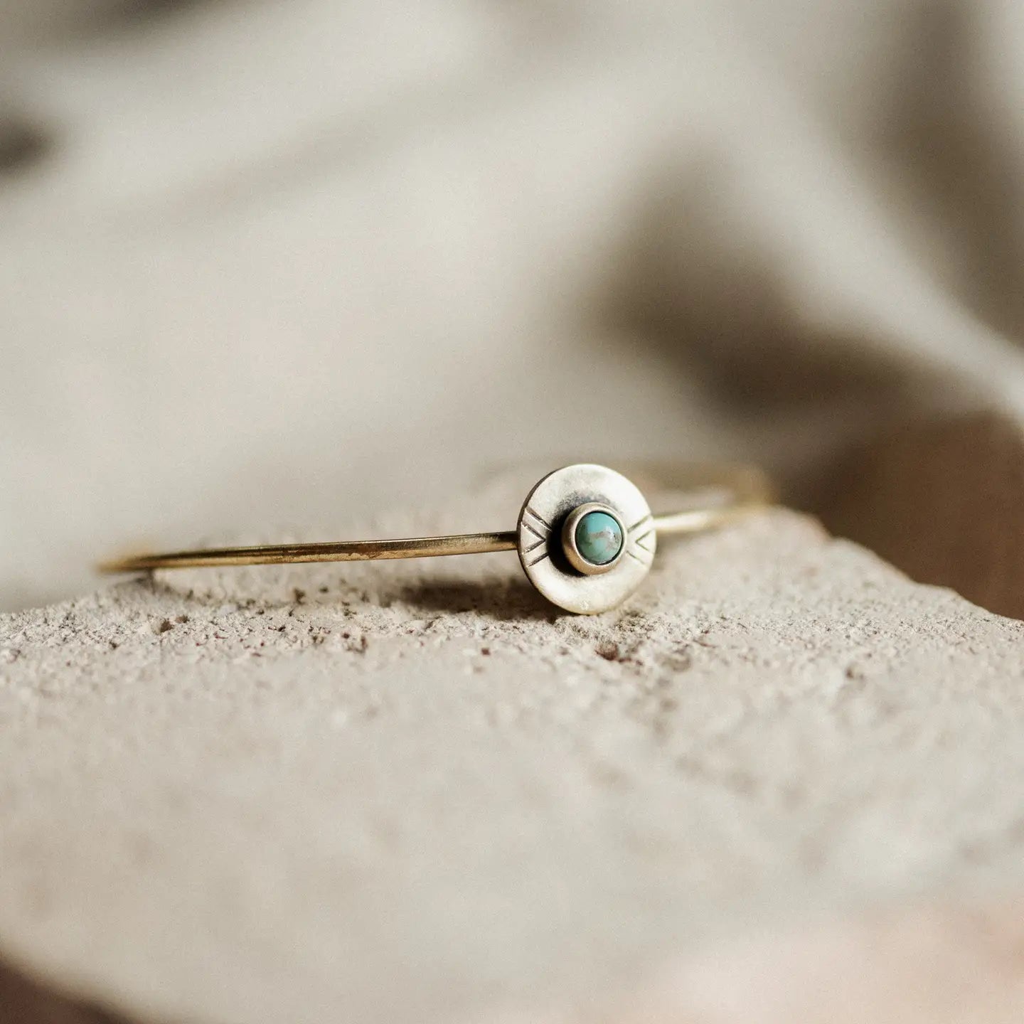 A dainty, solid brass adjustable cuff with your choice of a 6 or 8mm bezel set turquoise stone. These cuffs are cut, hammered, bent, and soldered by hand, then paired...