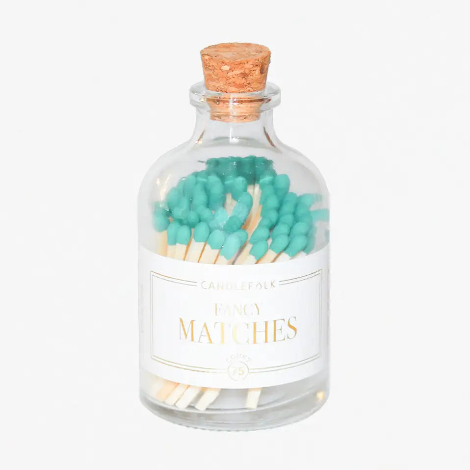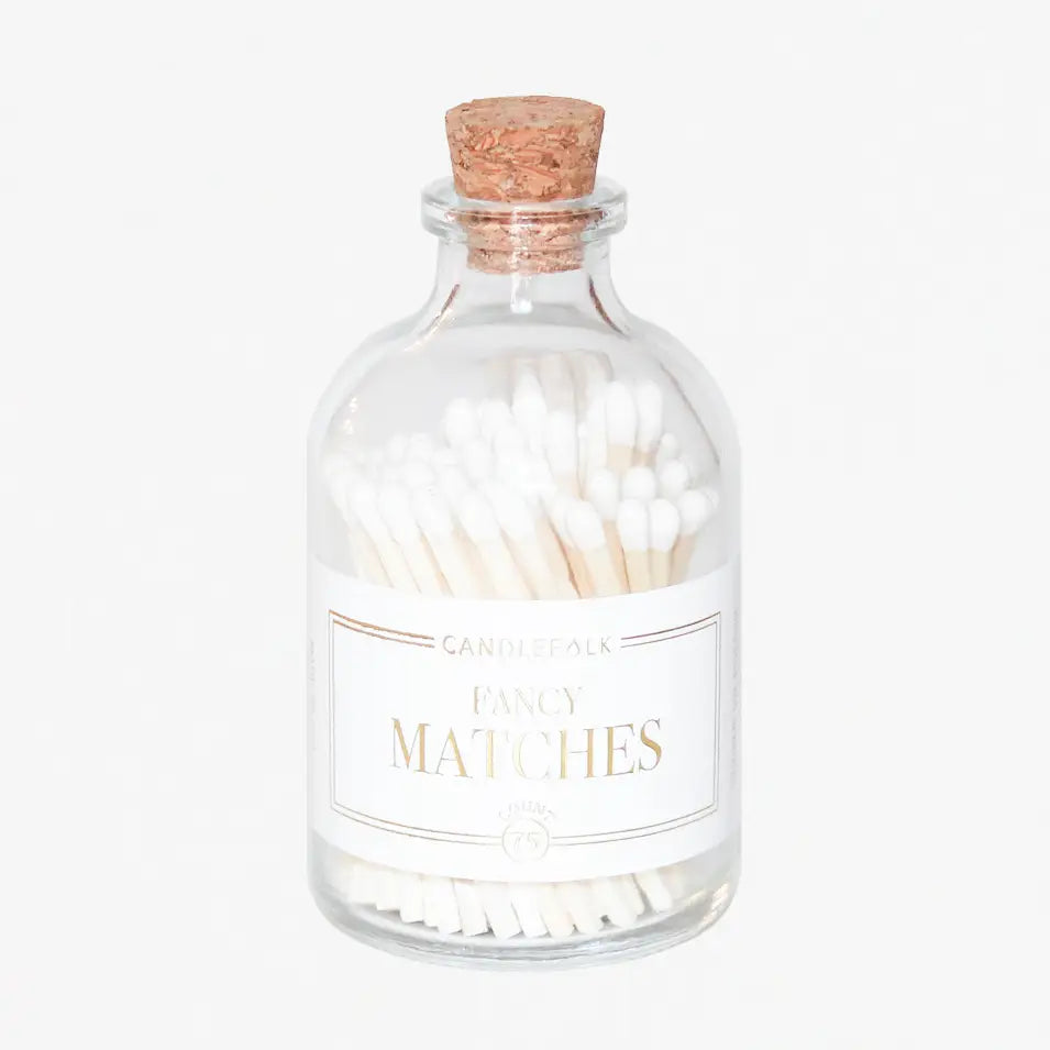 Colored tip matches in an apothecary-inspired glass bottle with a cork top and a striker on the bottom. Approximately 75 matches included. Bottle Dimensions: 3" tall x 1.75" wide /...