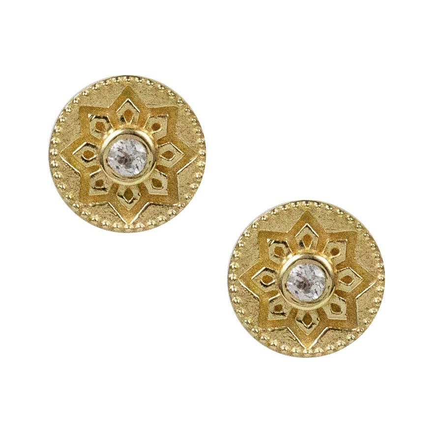 Bloom bright with our Melina Studs. A decorative gold vermeil round features a petaled motif and a faceted gemstone at center.