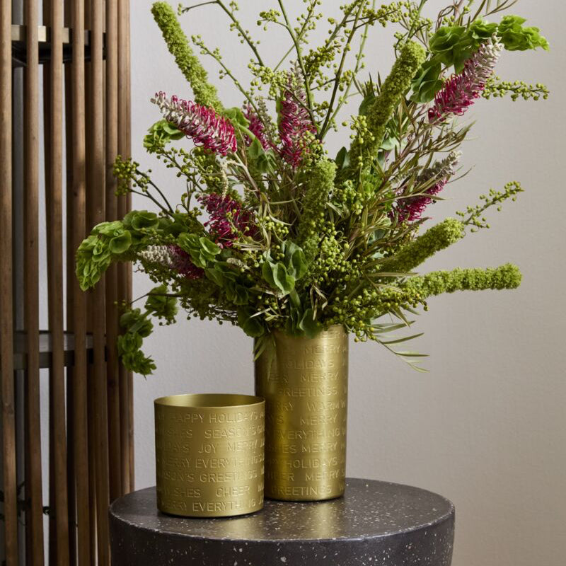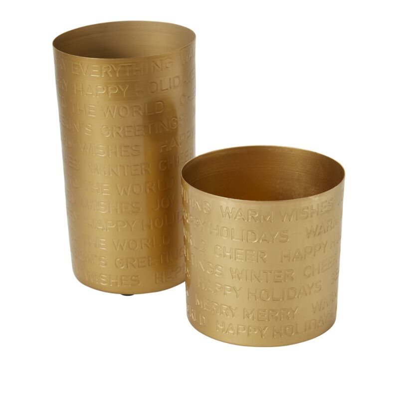 This collection features both a pot and a vase, each crafted from gold metal etched with holiday phrases such as "MERRY EVERYTHING," "SEASON'S GREETINGS," and "HAPPY HOLIDAYS." Perfect for showcasing...