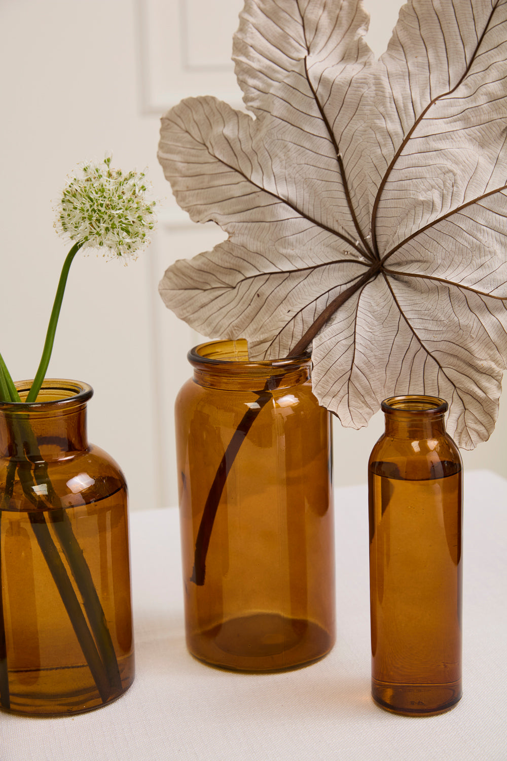 Let the flowers steal the show with the Amber Billie Bottle Collection, a family of five warm, translucent amber vases and budvases in sizes that can be grouped together for a collected, charming display. These are perfect for a bunch of fresh or dried stems. We recommend gently cleaning the surface with a damp cloth to protect the beautiful color. 4.25"x8.25" Vase is the middle one pictured