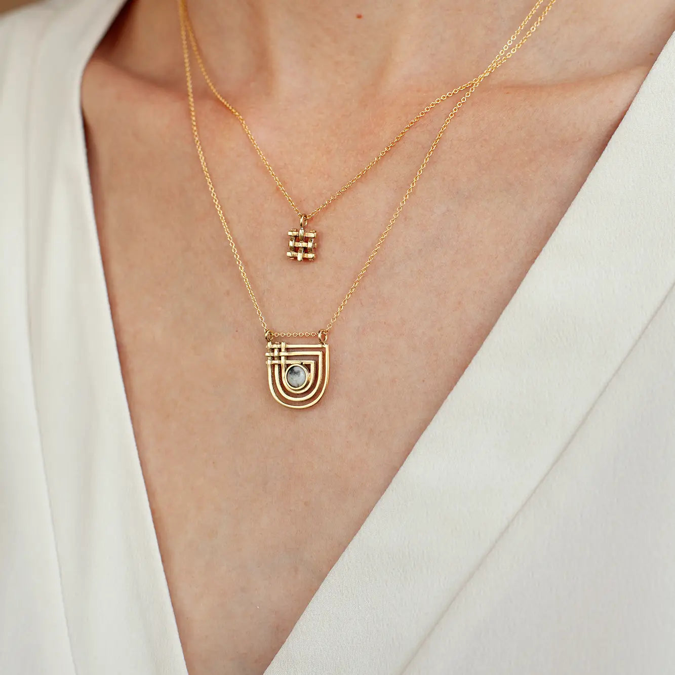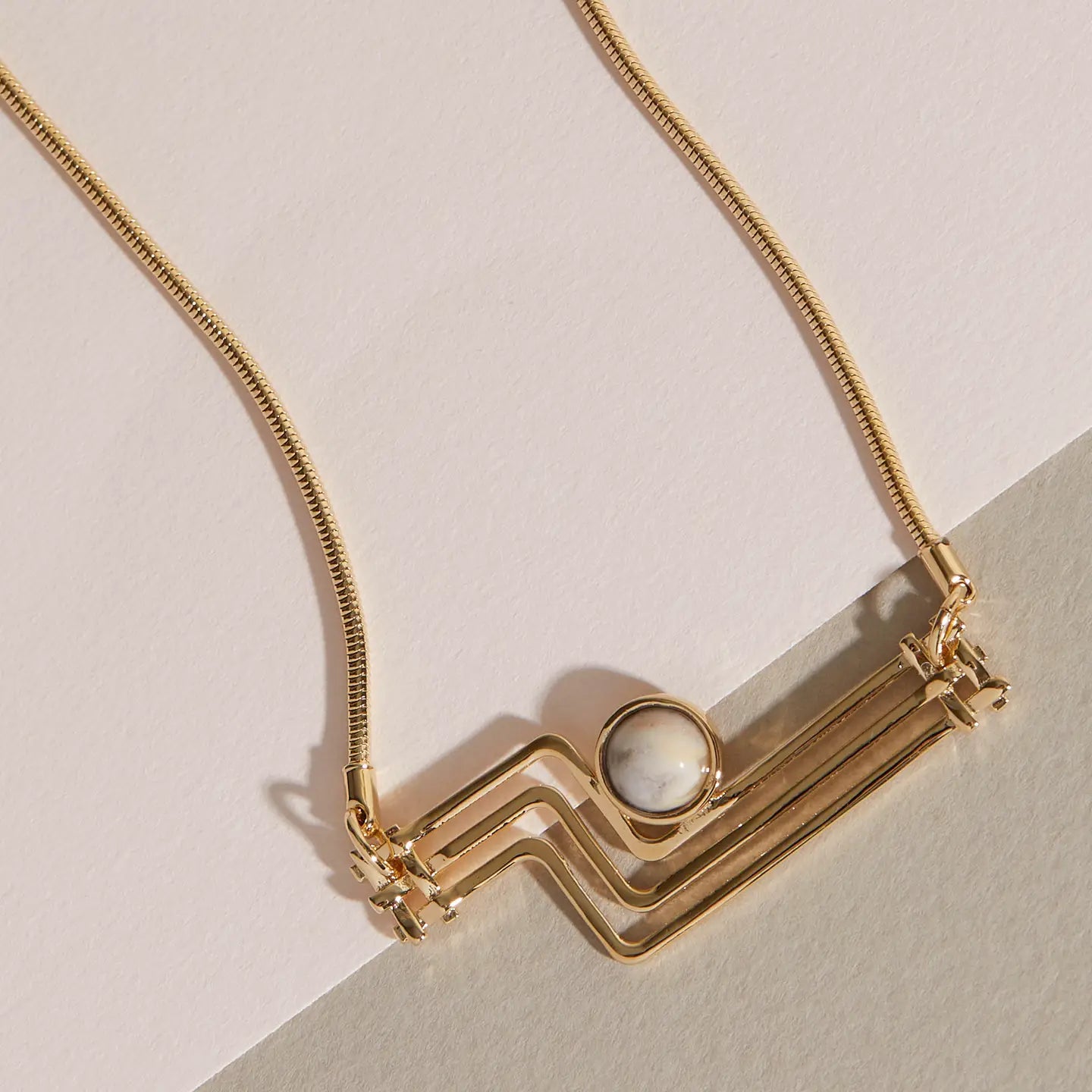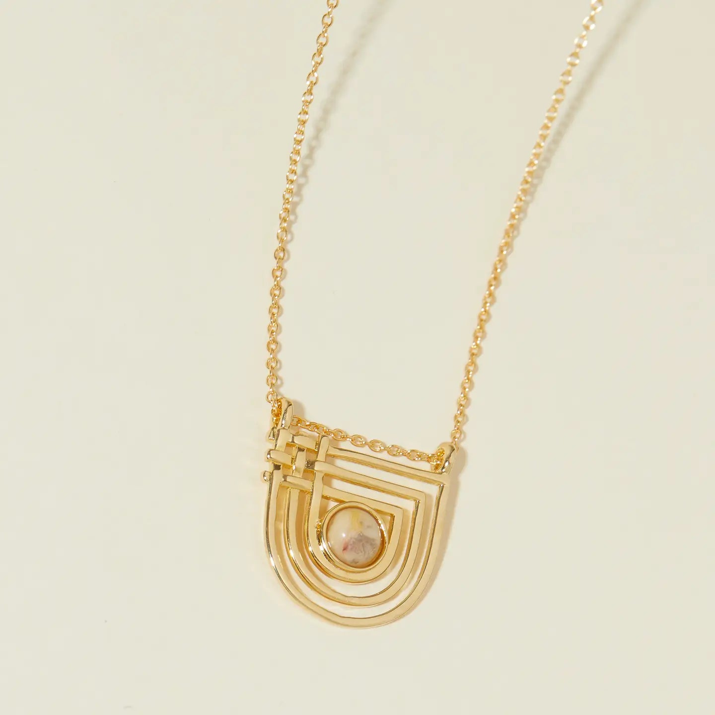 Enter your own golden era with this piece featuring 14k gold filled chain and gold-plated pendant with a curved and crosshatch pattern. Neutral, crazy lace agate stone in the center. ...