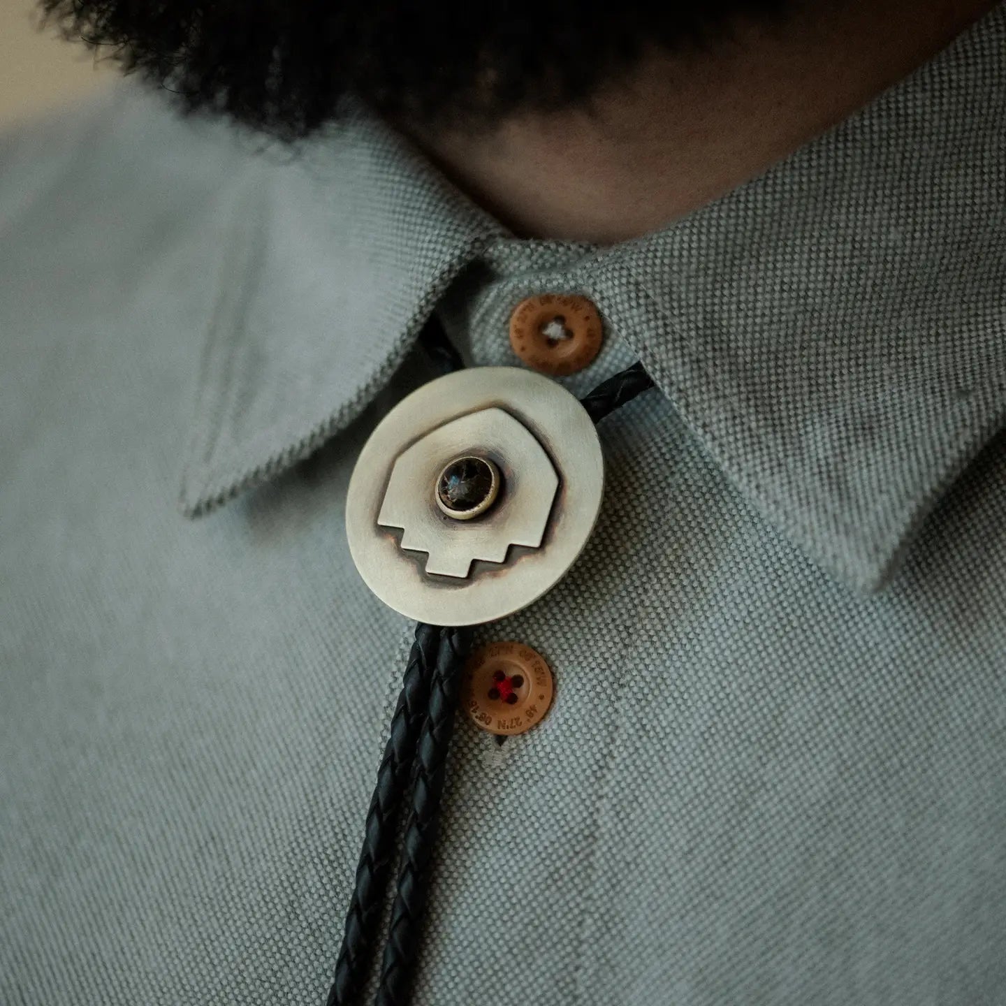 A brushed, hand-patinaed, solid brass 40mm pendant with an 8mm bezel set copper obsidian stone on your choice of black braided leather cord with solid brass tips, and a hinged...