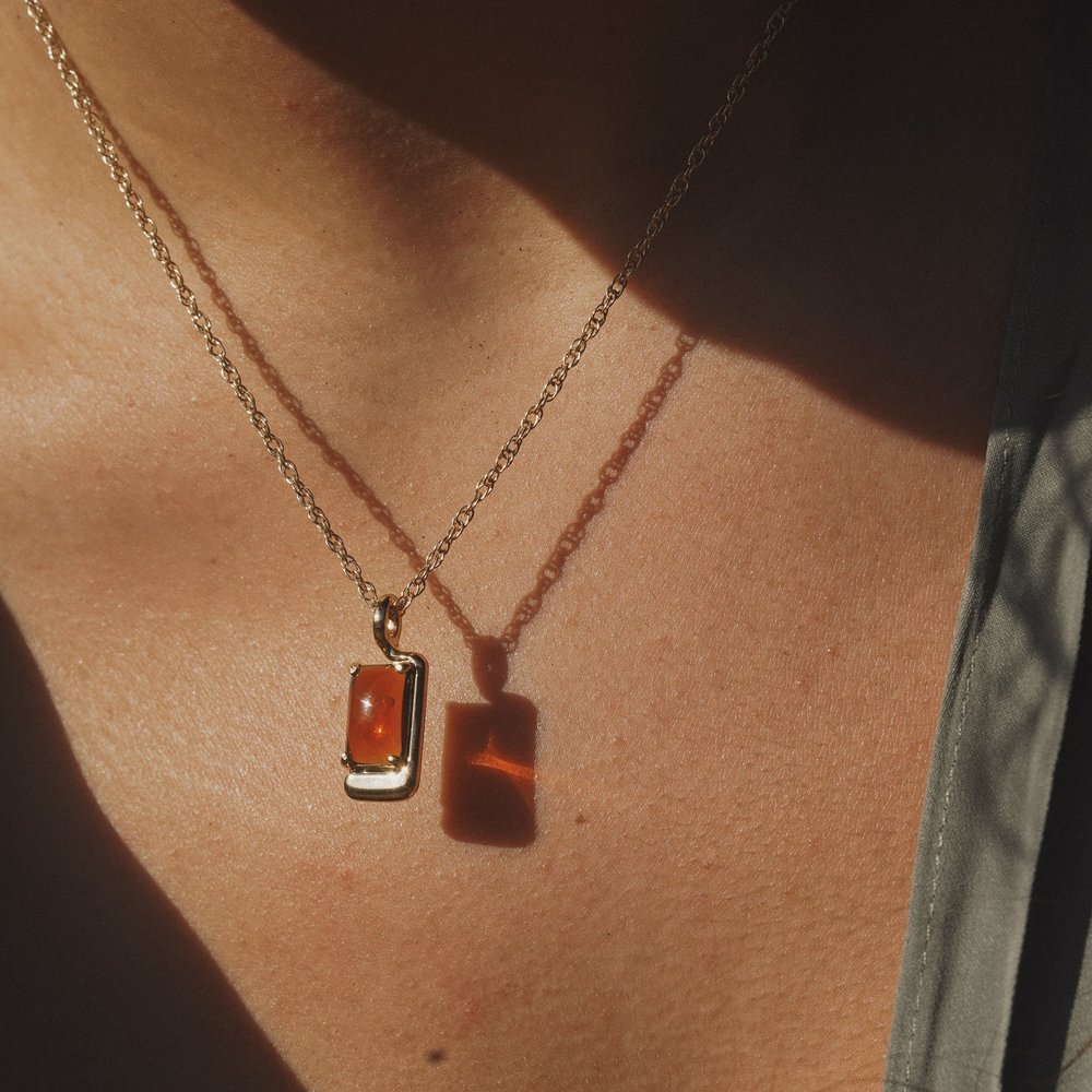 A warm amber colored cabochon is set into this asymmetrical pendant in a sophisticated and modern necklace.