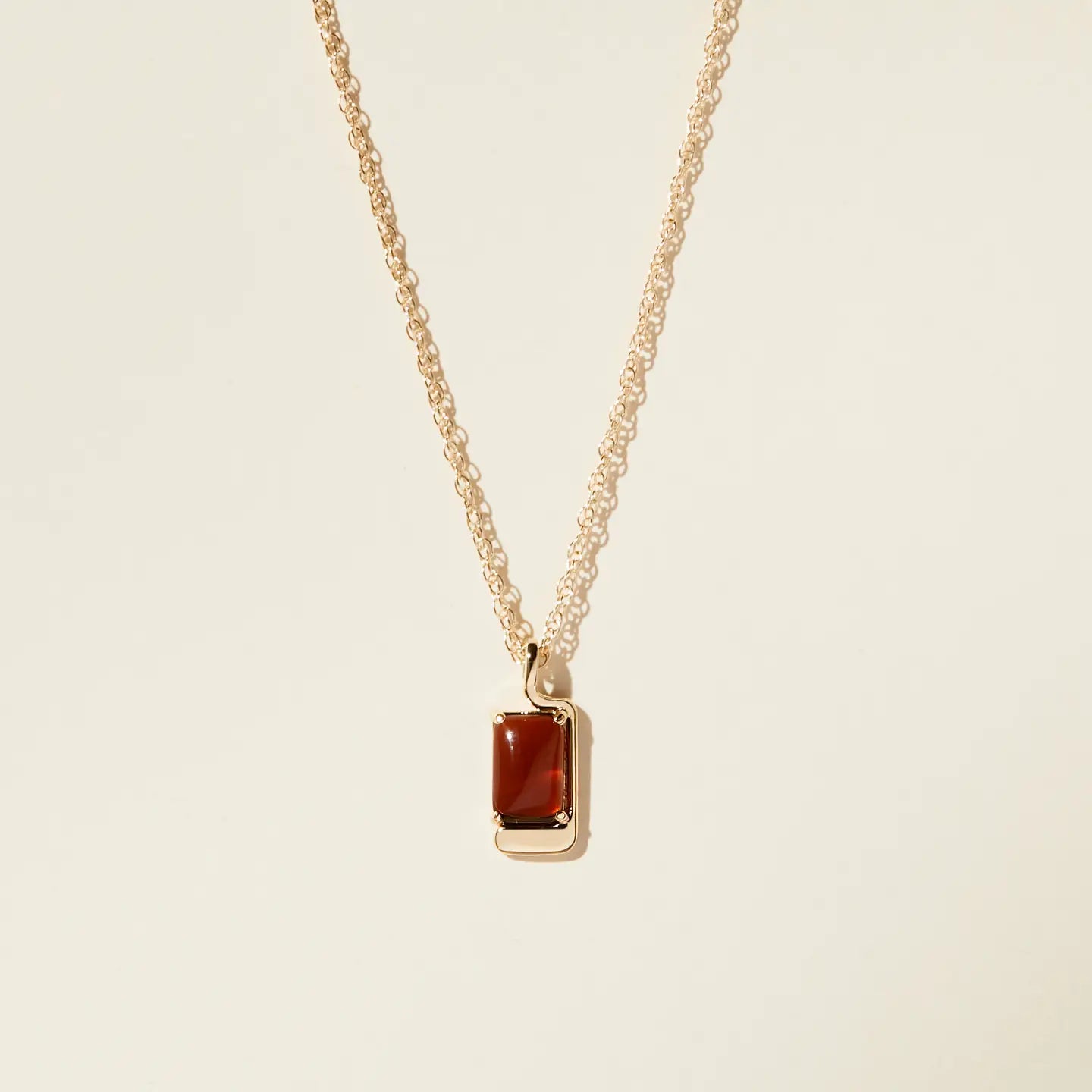 Modern, rectangular pendant with red and blue cabochons slides on a gold filled cable chain.