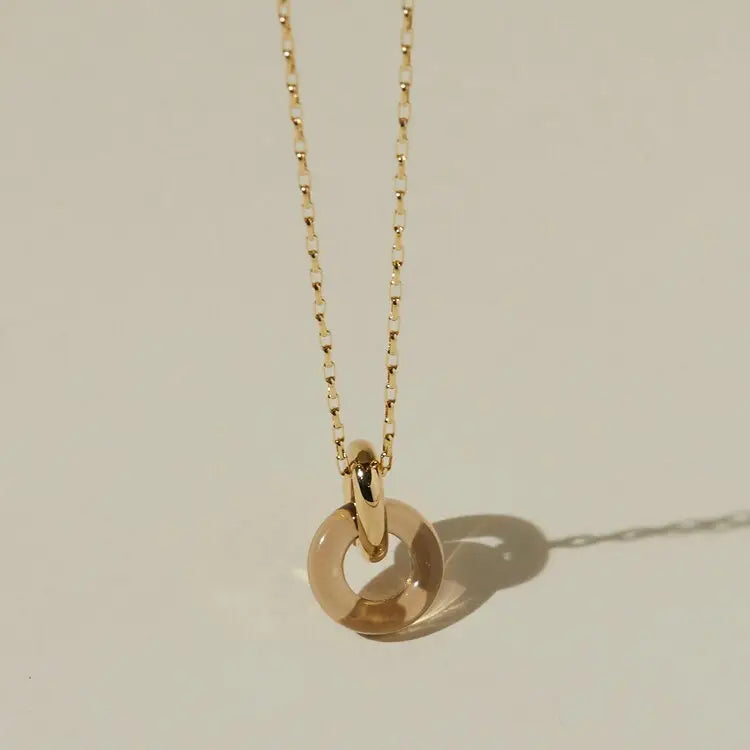 A modern staple with a pop of color! A hand cast and polished oval link coupled with a beige glass ring. Czech glass 16” gold filled chain Gold plated pendant...