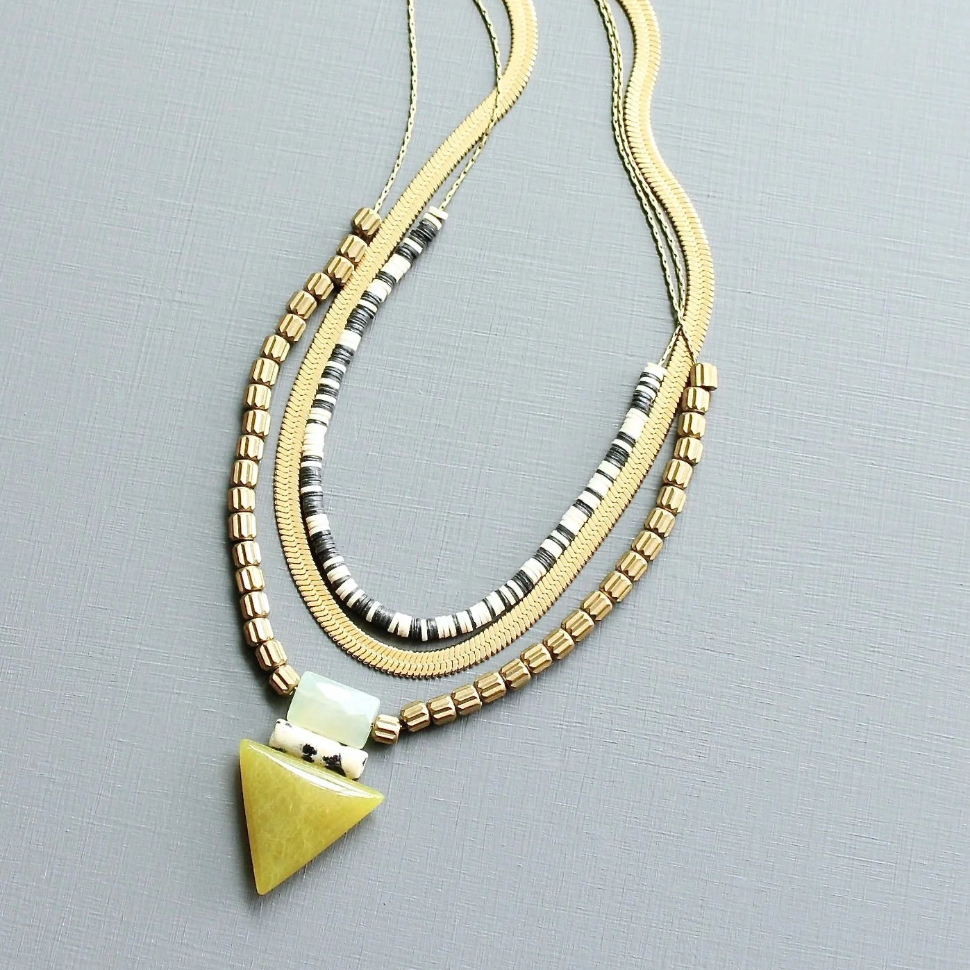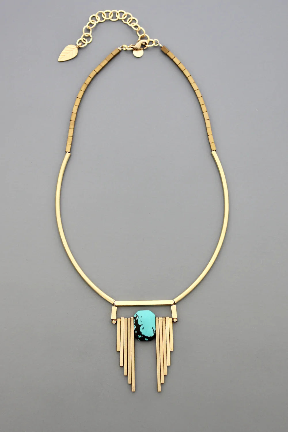Geometric brass bar pendant with turquoise oval stone beads on double strand gold tone plated chain. Measures 16 inches long + 1 inch extender