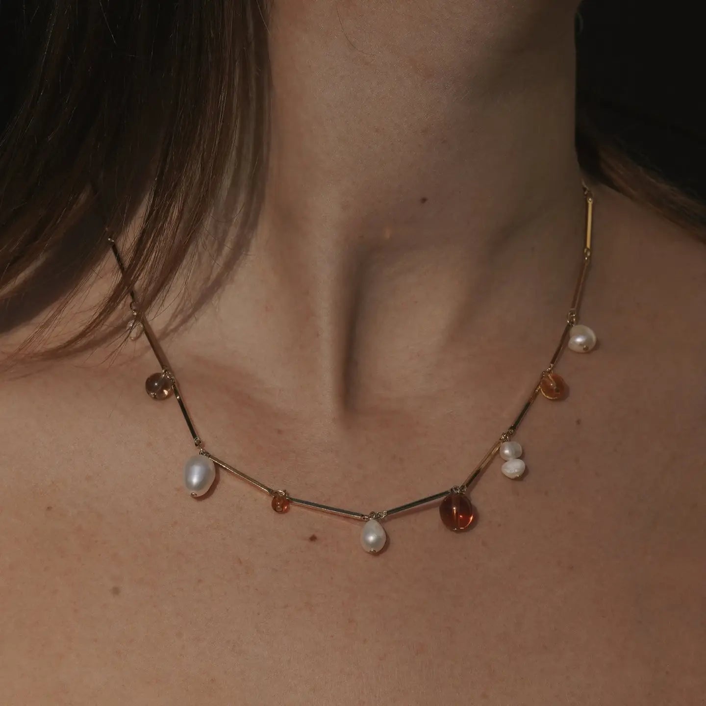 Fête means celebration and this necklace will be your next party staple. Sophisticated yet playful, the freeform pearls and translucent glass dangle from modern bar chain. Czech glass and pearls...