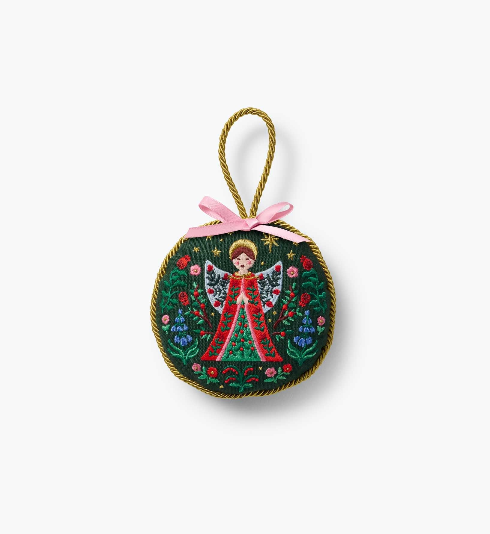 A keepsake gift or heirloom accent for your own tree, this ornament features embroidered illustrations, gold thread detailing, twisted piping, and a loop for hanging. Polyester and cotton Embroidered elements...