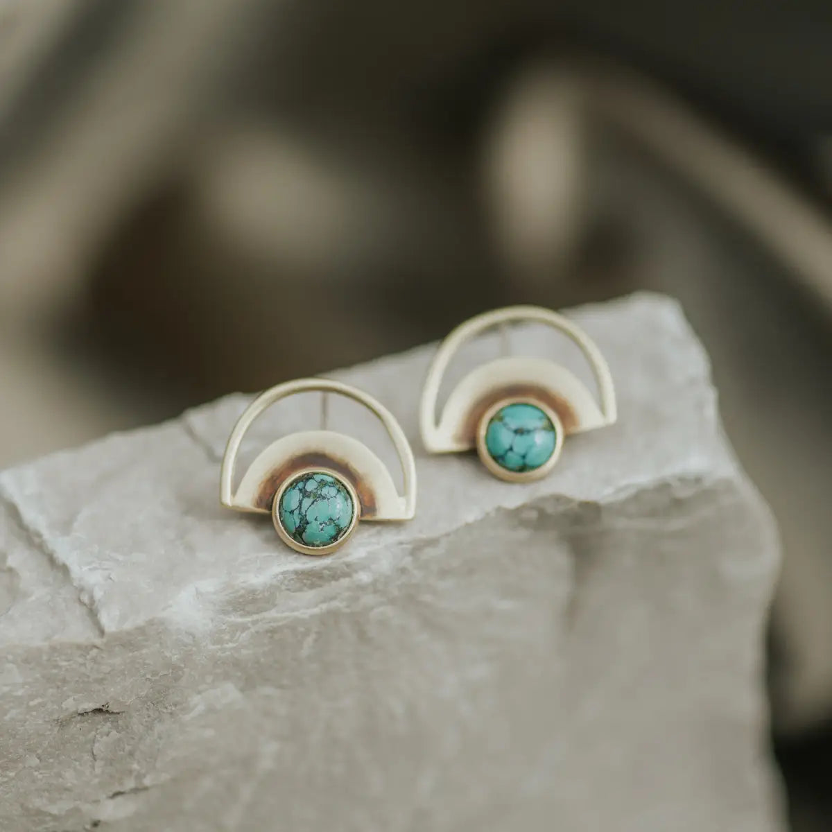 8mm bezel set turquoise pieces sit on 20mm solid brass crescents with an intentional patina.
